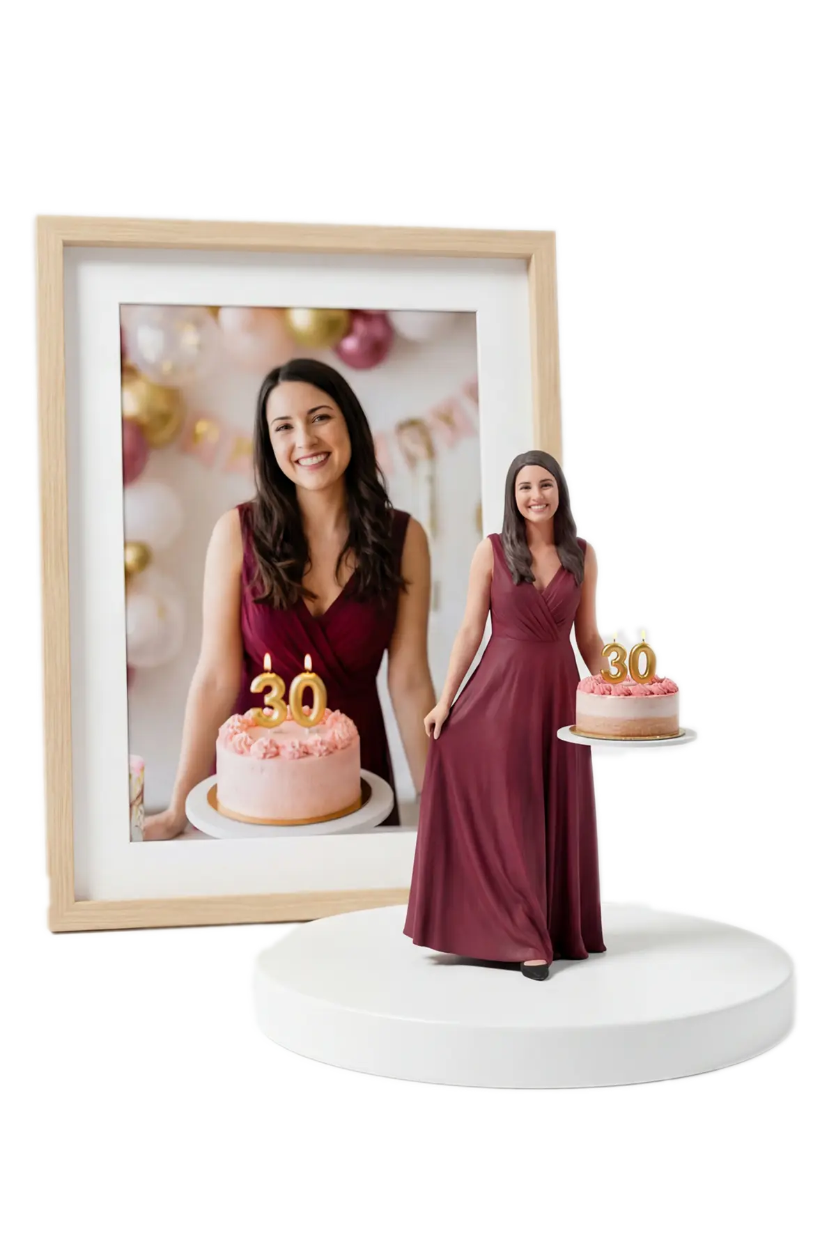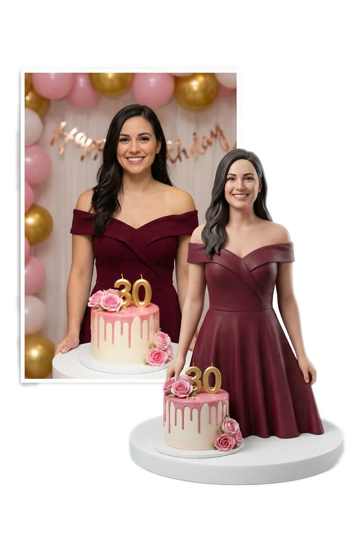 Всяка 3D фигура за рожден ден се създава индивидуално. Работим с висока детайлност и обръщаме внимание на излъчването, позата и малките детайли. Можем да пресъздадем прическа, облекло, аксесоари и специфични елементи от снимката. Ако желаете, добавяме надпис (име/дата/пожелание) и години (например „30“, „40“, „60“).